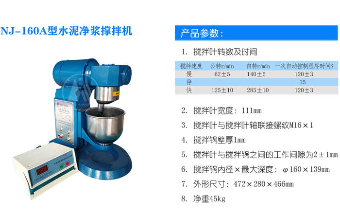 本機是貫徹GB1346-2001所規定的專用設備之一,是按JC/T729-2005主要技術參數制造的新型雙轉雙速凈漿攪拌機。是按標準規定的水泥和水混合后攪拌成均勻的試驗用凈漿,供測定水泥標準稠度、凝結時間及制作安定性試塊之用,是水泥廠、建筑施工單位、有關專業院校及科研單位水泥試驗室必備的,不可缺少的設備之一。